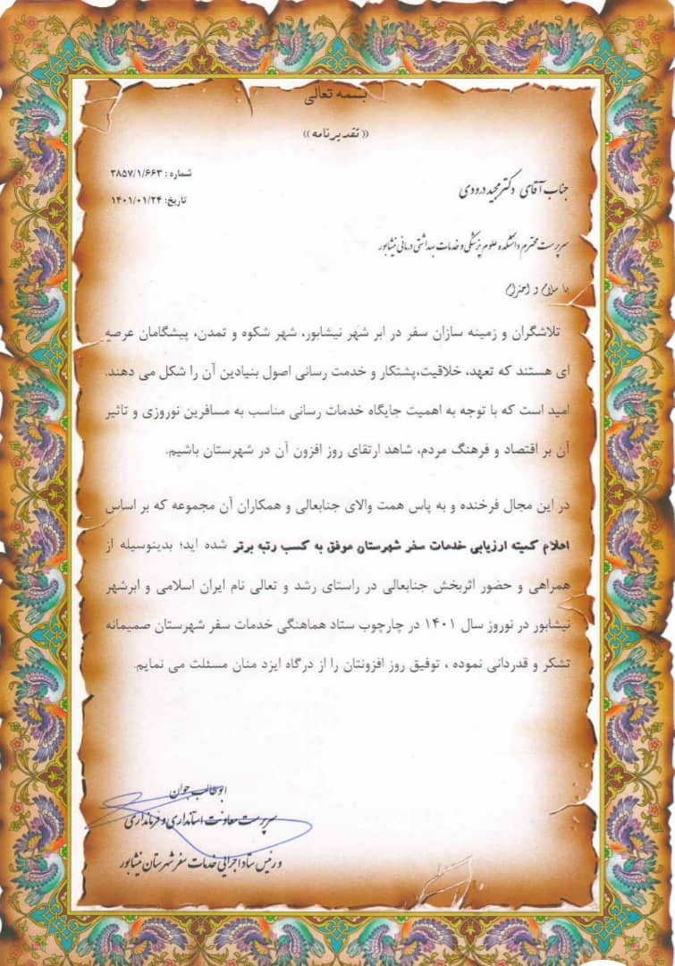 مصطفی افشارنیک افزود: در جلسه ای که در تاریخ بیست و چهارم فروردین ماه با حضور همه ی ارگان ها و ادارات در سالن همایش دبیرستان خیام برگزار شد، دانشکده علوم پزشکی از سوی کمیته ارزیابی خدمات سفر به عنوان دستگاه برتر طرح سلامت نوروزی سال ۱۴۰۱ انتخاب شد.