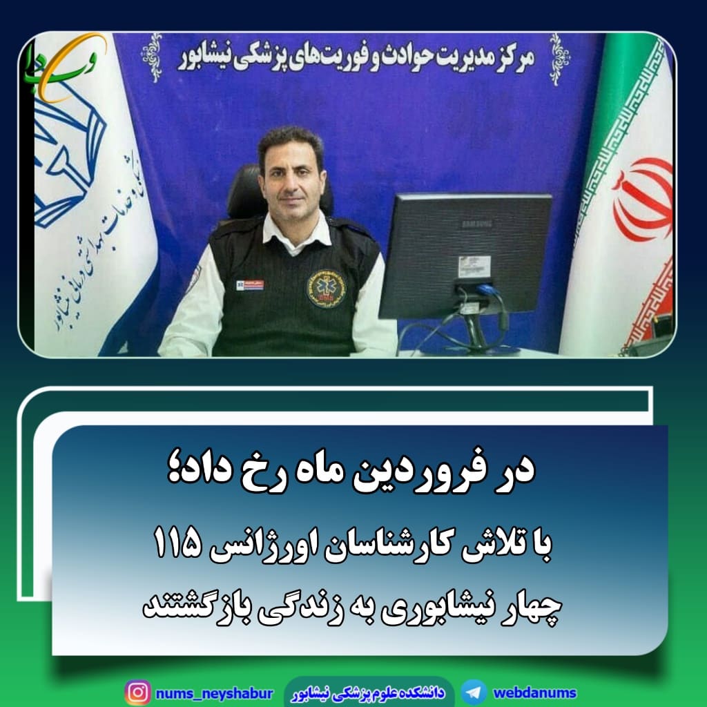 رئیس اورژانس پیش بیمارستانی شهرستان های نیشابور،فیروزه و زبرخان گفت: به همت کارشناسان اورژانس ۱۱۵ چهار نیشابوری در فروردین ماه به زندگی بازگشتند.